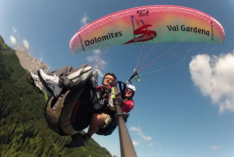 Fly with the professional tandem pilots for a paraglider tandem flight silently over the most impressive mountain scenery of the Dolomites. We start from the Seceda, the Ciampinoi or from Col Rodella at Passo Sella and glide flying down to Val Gardena. Regardless, even enjoy the bird’s eye view and experience, fly yourself or give a paraglider tandem flight voucher for an unforgettable experience.
